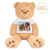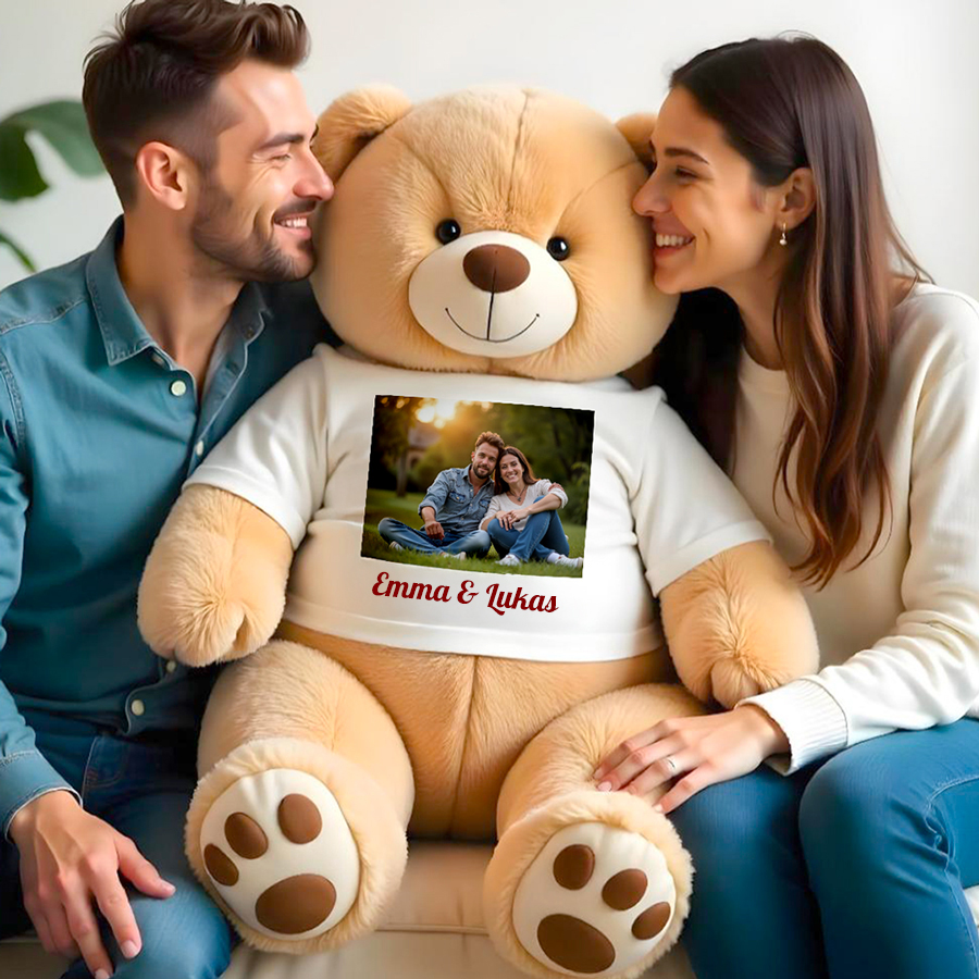 Ein riesiger Teddybär als Spiegel Ihrer Liebe! Personalisieren Sie sein T-Shirt mit einem Foto in einem eleganten Kranz und fügen Sie einen Namen hinzu. Ein liebevolles und unvergessliches Geschenk für Groß und Klein!